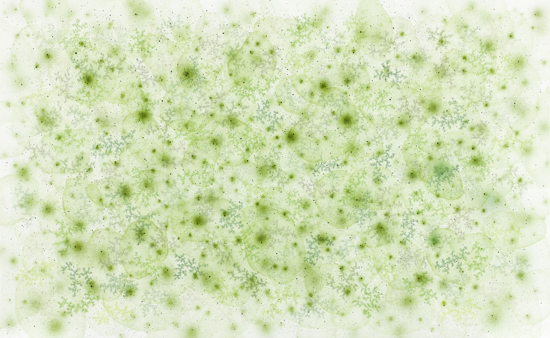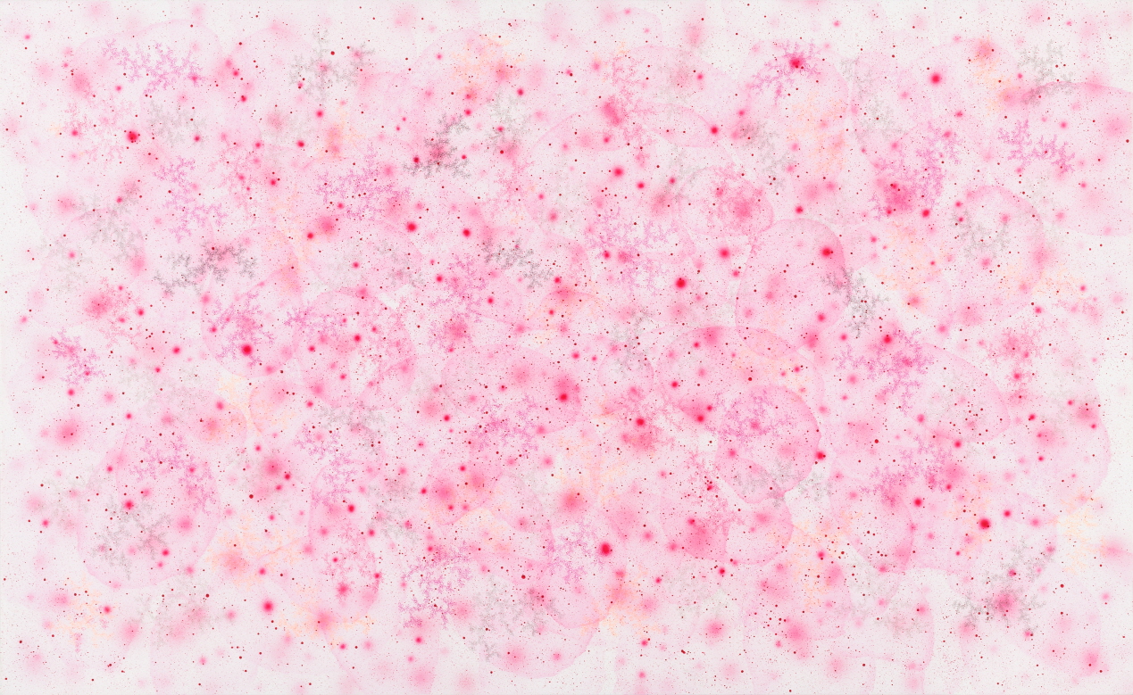 이강욱의 화면에서 공간은 결코 고정된 구조로 제시되지 않는다. 미세한 입자처럼 흩어지거나 응축된 색의 집합, 반복되는 기하학적 형상, 그리고 층위가 다른 제스처들은 하나의 안정된 시점을 허용하지 않으며, 관객은 화면 앞에서 끊임없이 스케일을 재조정하게 된다. 이는 미시와 거시, 내부와 외부, 평면과 깊이 사이를 오가는 지각의 운동을 유도하며, 회화가 여전히 감각적 경험의 장이 될 수 있음을 증명한다.