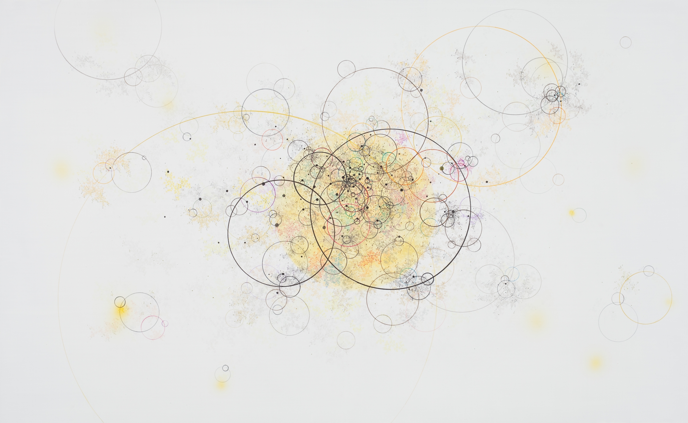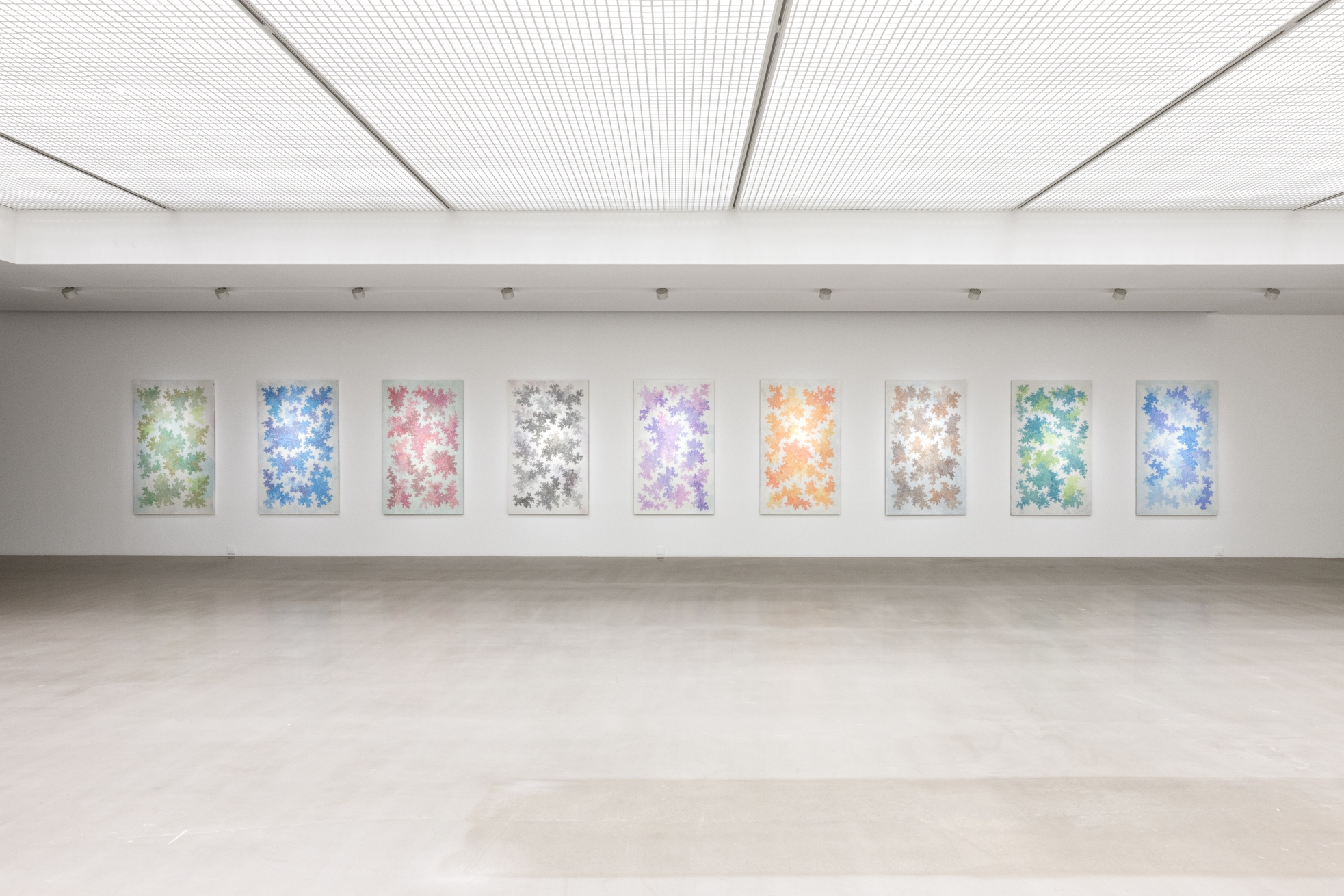 섬세하게 그려진 선과 옅은 색면들이 회화의 표면을 부유한다. 타원과 사각형태들이 여러 다른 크기로 등장하고, 때로는 완전한 형을 이루지 못한 채 형태의 제안에 머물며, 또 한편으로는 마치 공간적 연속을 이루듯 반복적으로 겹쳐진다